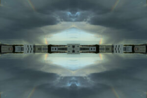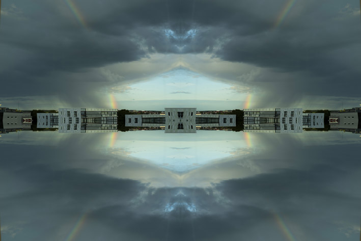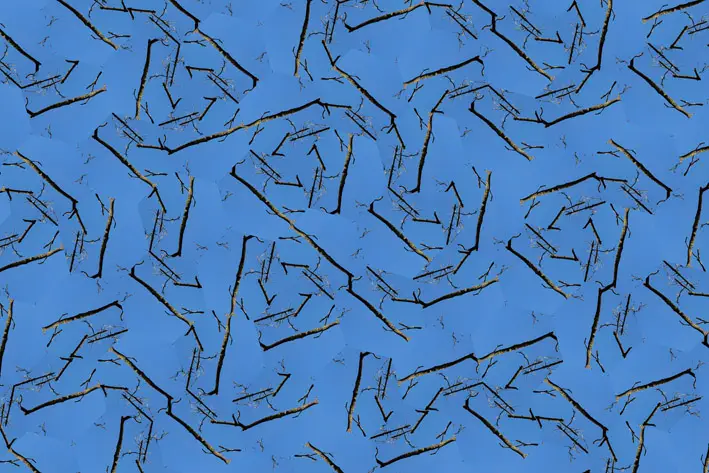 Med flere billeder, eller udsnit heraf, kombineret på billedfladen, pointeres de linjer, figurer og farver, der har sat processen i gang. Uventede konstellationer opstår.